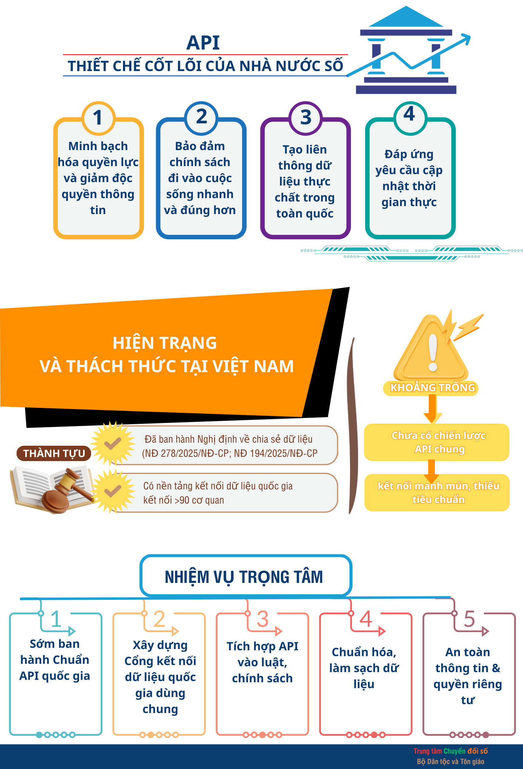 Trong kỷ nguyên số, API (Application Programming Interface) hay còn gọi là Cổng kết nối dữ liệu, là chuẩn kỹ thuật trung tâm cho phép các hệ thống trao đổi dữ liệu an toàn, có kiểm soát. API là điều kiện tiên quyết để thực hiện nguyên tắc "Khai một lần - dùng nhiều nơi" của Chính phủ số.