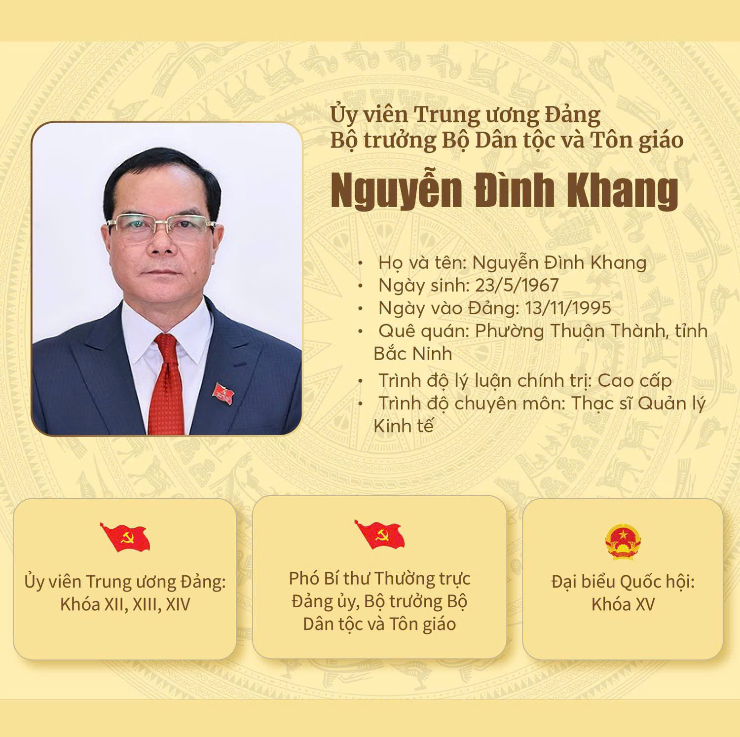 Sáng 08/4, tại Kỳ họp lần thứ Nhất, Quốc hội khóa XVI đã chính thức phê chuẩn ông Nguyễn Đình Khang, Ủy viên Ban Chấp hành Trung ương Đảng, Thứ trưởng Thường trực Bộ Dân tộc và Tôn giáo giữ chức Bộ trưởng Bộ Dân tộc và Tôn giáo nhiệm kỳ 2026-2031.