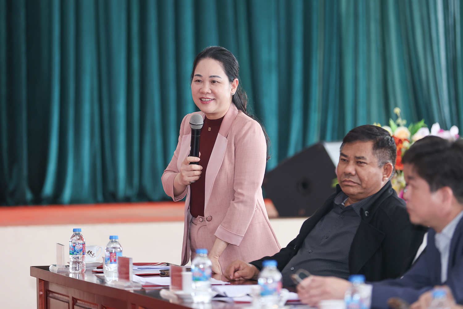 Đồng chí Nông Thị Hà, Ủy viên Ban Thường vụ, Trưởng Ban Tuyên giáo và Dân vận Đảng ủy, Thứ trưởng Bộ Dân tộc và Tôn giáo phát biểu tại buổi làm việc