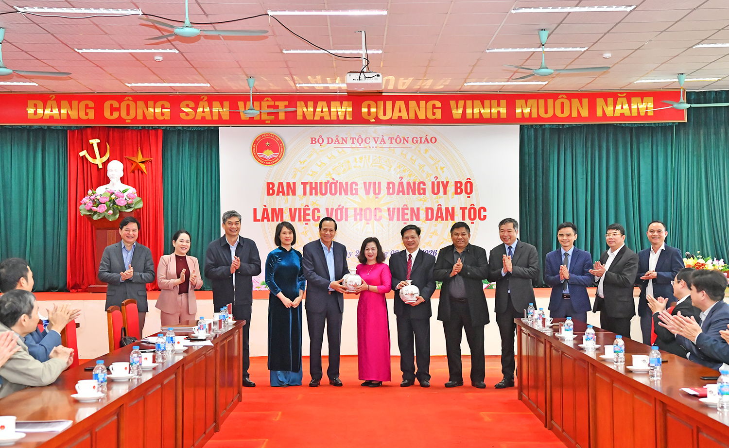 Ban Thường vụ Đảng ủy Bộ Dân tộc và Tôn giáo chụp ảnh lưu niệm cùng tập thể Lãnh đạo, viên chức, người lao động Học viện Dân tộc
