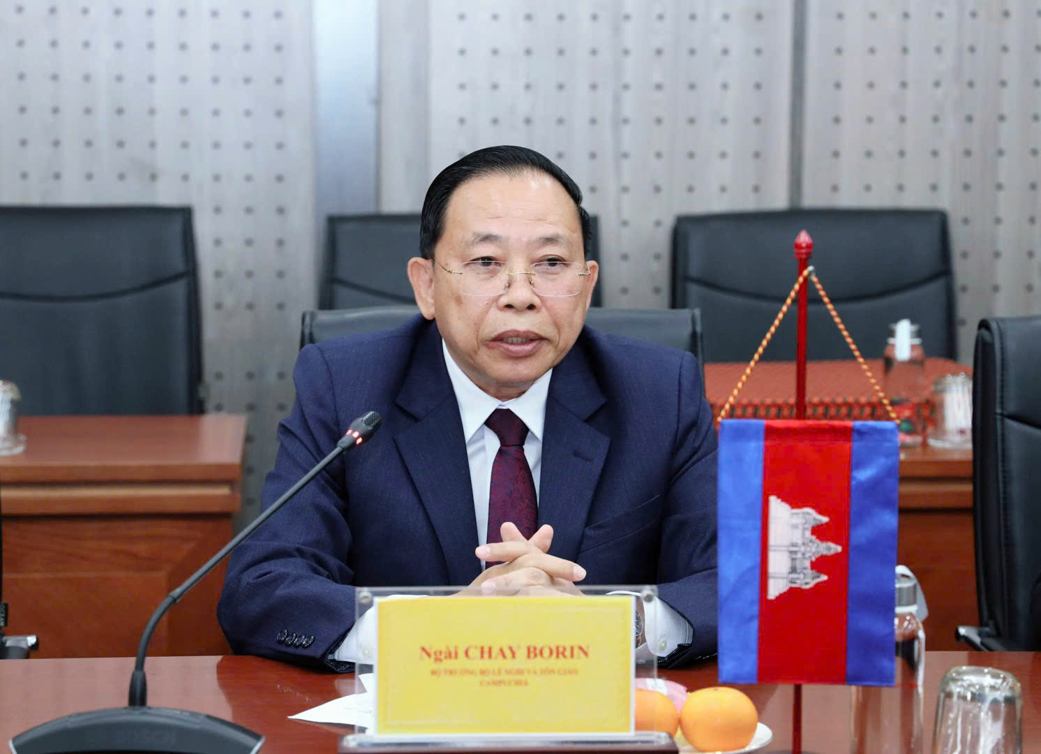 Mở đầu cuộc hội đàm, Bộ trưởng Đào Ngọc Dung vui mừng đón tiếp Bộ trưởng Chay Borin cùng đoàn công tác của Bộ Lễ nghi và Tôn giáo Vương quốc Campuchia thăm và làm việc tại Việt Nam. Bộ trưởng Đào Ngọc Dung nhấn mạnh, chuyến thăm của đoàn diễn ra trong bối cảnh mối quan hệ giữa hai nước đang ở giai đoạn phát triển tốt đẹp nhất, dưới phương châm “Láng giềng tốt đẹp, hữu nghị truyền thống, hợp tác toàn diện, bền vững lâu dài”.