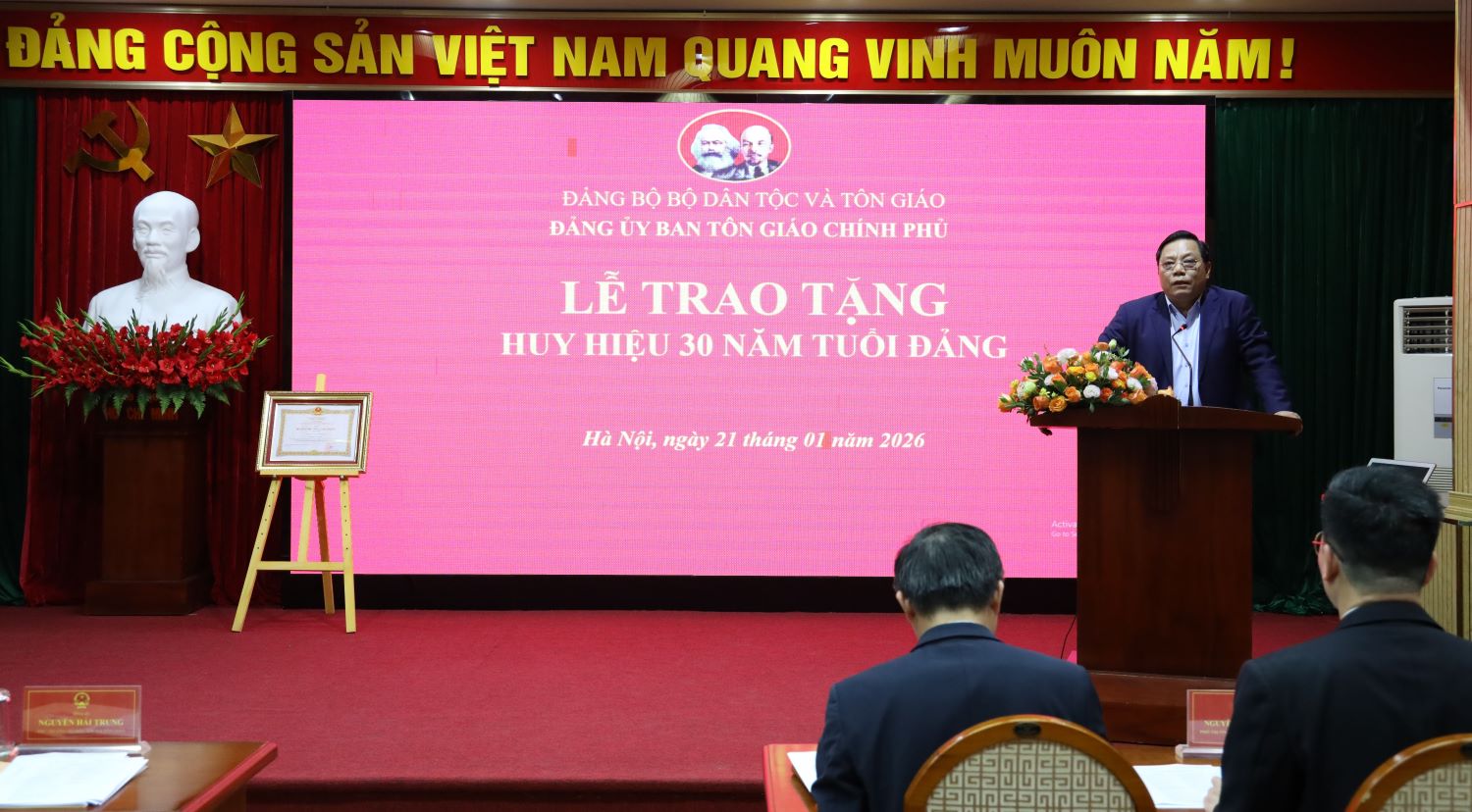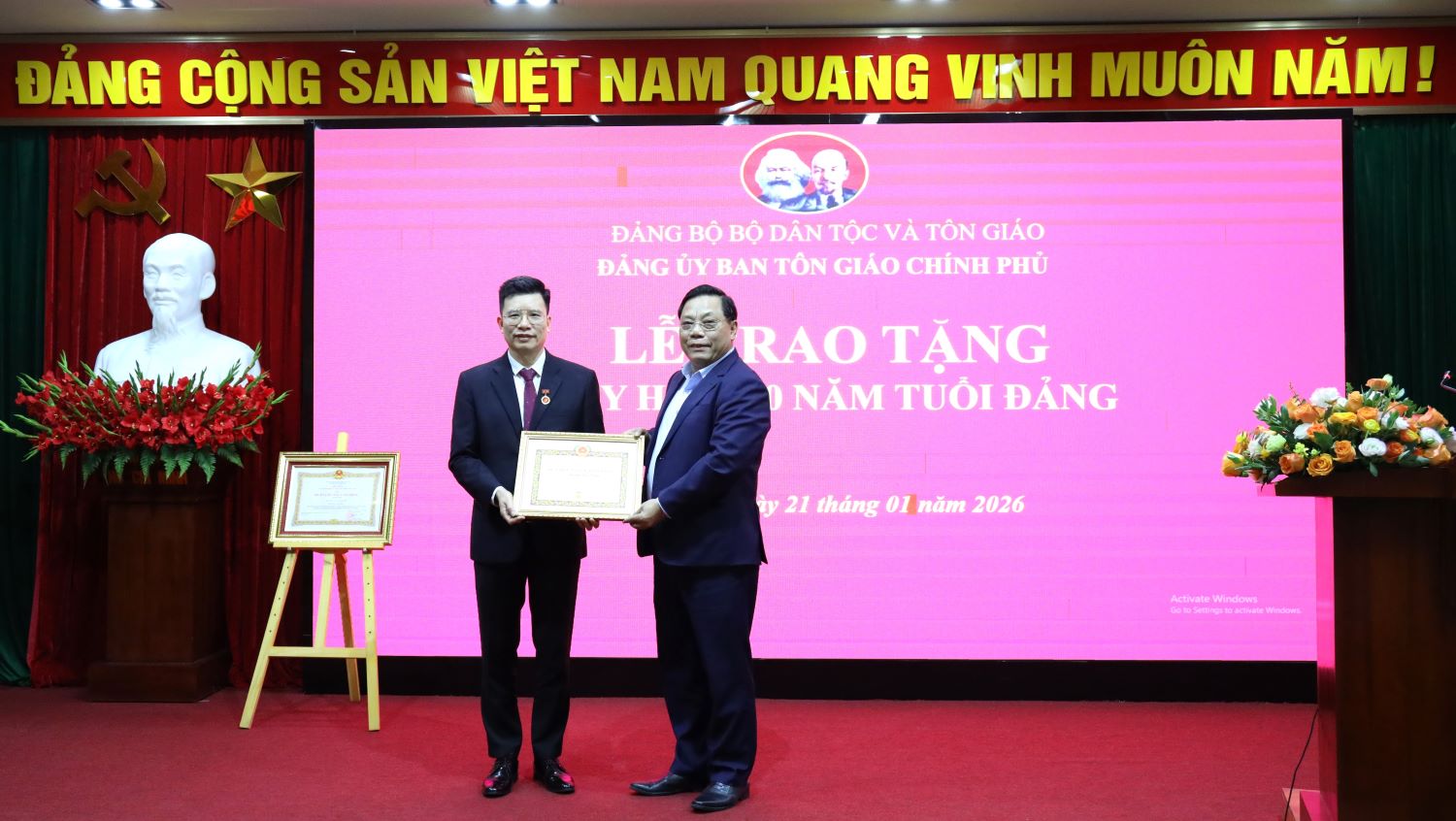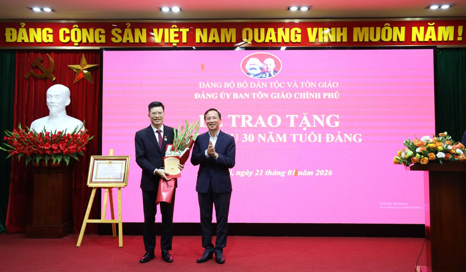 Thứ trưởng Bộ Dân tộc và Tôn giáo Nguyễn Hải Trung trao Huy hiệu 30 năm tuổi đảng cho lãnh đạo Ban Tôn giáo Chính phủ