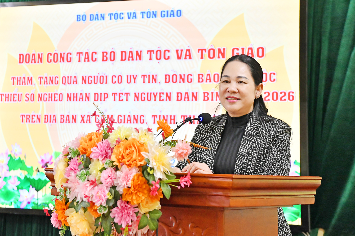 Thứ trưởng Nông Thị Hà chia sẻ với những khó khăn của đồng bào dân tộc thiểu số khi phải hứng chịu những tác động của thiên tai, biến đổi khí hậu, đồng thời bày tỏ mong muốn trong năm mới 2026, đồng bào dân tộc thiểu số trên địa bàn tỉnh sẽ tiếp tục nỗ lực vươn lên, khắc phục các khó khăn, nhanh chóng thoát nghèo, và chung sức đồng lòng với chính quyền địa phương để xây dựng quê hương ngày càng tốt đẹp.