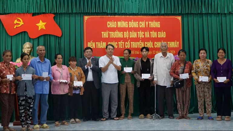 Tại tỉnh An Giang, Thứ trưởng Bộ Dân tộc và Tôn giáo Y Thông đã đến thăm, chúc mừng các tổ chức, hộ gia đình, cá nhân tiêu biểu, người có uy tín và hộ nghèo là đồng bào Khmer nhân dịp Tết cổ truyền Chôl Chnăm Thmây năm 2026 tại các xã: Định Hòa, Gò Quao, Long Thạnh, Châu Thành và phường Rạch Giá.