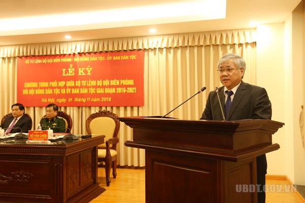 Phát biểu tại buổi Lễ, Bộ trưởng, Chủ nhiệm UBDT Đỗ Văn Chiến nhấn mạnh Lễ ký chương trình phối hợp là việc làm thiết thực, thể hiện trách nhiệm, tình cảm của các cơ quan công tác dân tộc, cơ quan biên phòng đối với an ninh biên giới quốc gia và đời sống của đồng bào các dân tộc. Ban Cán sự Đảng, Lãnh đạo UBDT tin tưởng, thông qua Chương trình phối hợp, cơ quan công tác dân tộc từ trung ương đến địa phương, sẽ phối hợp chặt chẽ với lực lượng bộ đội biên phòng trong việc nắm vững tình hình để kịp thời tham mưu, kiến nghị với cơ quan có thẩm quyền các giải pháp sát thực nhằm giữ vững chủ quyền lãnh thổ, an ninh biên giới quốc gia, đẩy mạnh phát triển kinh tế - xã hội, nâng cao đời sống tinh thần, vật chất cho nhân dân. Cộng đồng các dân tộc thiểu số Việt Nam mong muốn tiếp tục nhận được nhiều hơn nữa sự quan tâm, giúp đỡ có hiệu quả của hai cơ quan, đơn vị để vùng dân tộc thiểu số khu vực miền núi, biên giới ngày càng phát triển, mọi gia đình có cuộc sống ấm no, hạnh phúc.