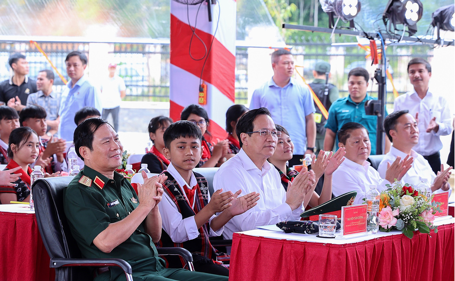 Bộ trưởng Bộ Dân tộc và Tôn giáo Đào Ngọc Dung; Đại tướng Nguyễn Tân Cương – Tổng Tham mưu trưởng Quân đội nhân dân Việt Nam, Thứ trưởng Bộ Quốc phòng dự lễ khởi công. (Ảnh: Nhật Bắc)