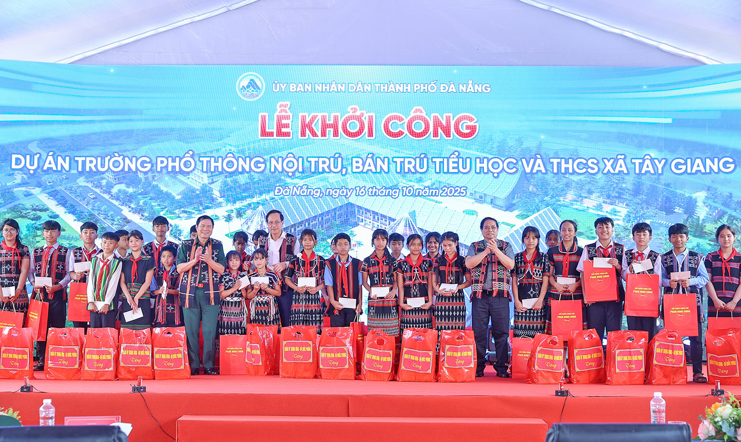 Tại buổi lễ, Thủ tướng Phạm Minh Chính đã trao 100 phần quà ý nghĩa tặng học sinh trường phổ thông nội trú, bán trú tiểu học và trung học cơ sở Tây Giang động viên, khuyến khích các em chăm ngoan, học giỏi; trao quà tặng 10 gia đình đã có nhiều đóng góp trong việc triển khai dự án xây dựng trường.