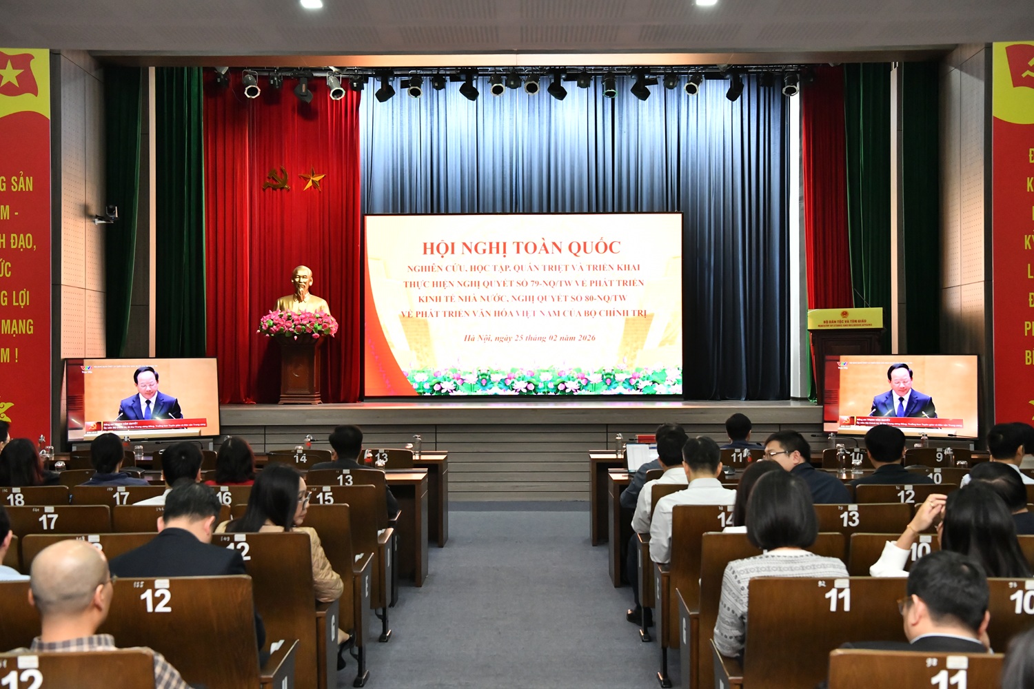 2 giờ trước | Lượt xem: 65 In bài viết |Ngày 25/02/2026, tại Hà Nội, Ban Bí thư Trung ương Đảng tổ chức Hội nghị toàn quốc nghiên cứu, học tập, quán triệt và triển khai thực hiện Nghị quyết số 79-NQ/TW của Bộ Chính trị về phát triển kinh tế nhà nước và Nghị quyết số 80-NQ/TW của Bộ Chính trị về phát triển văn hóa Việt Nam. Tổng Bí thư Tô Lâm dự và phát biểu chỉ đạo Hội nghị tại điểm cầu Trung ương.