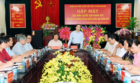 Phát biểu tại buổi gặp mặt, đồng chí Bí thư Tỉnh ủy Chẩu Văn Lâm đánh giá cao những đóng góp quan trọng của Đoàn đại biểu Quốc hội khóa XIII của tỉnh trong việc thực hiện những chương trình dự án lớn của tỉnh, đặc biệt là lĩnh vực xây dựng cơ sở hạ tầng, góp phần làm thay đổi diện mạo tỉnh. Đồng chí cũng nhấn mạnh vào một số vấn đề trọng tâm trong thời gian tới của tỉnh như xây dựng tuyến cao tốc nối Tuyên Quang với đường cao tốc Lào Cai - Hải Phòng; xây dựng thành phố Tuyên Quang trở thành đô thị loại II, thành lập huyện mới… Thay mặt các vị trúng cử đại biểu Quốc hội khóa XIV của tỉnh, đồng chí mong muốn Tỉnh ủy, HĐND, UBND, các sở, ngành, địa phương tiếp tục phối hợp tốt với các các đại biểu và Đoàn đại biểu Quốc hội khóa XIII của tỉnh hoàn thành chức trách, nhiệm vụ mà Đảng, Nhà nước và nhân dân giao phó.