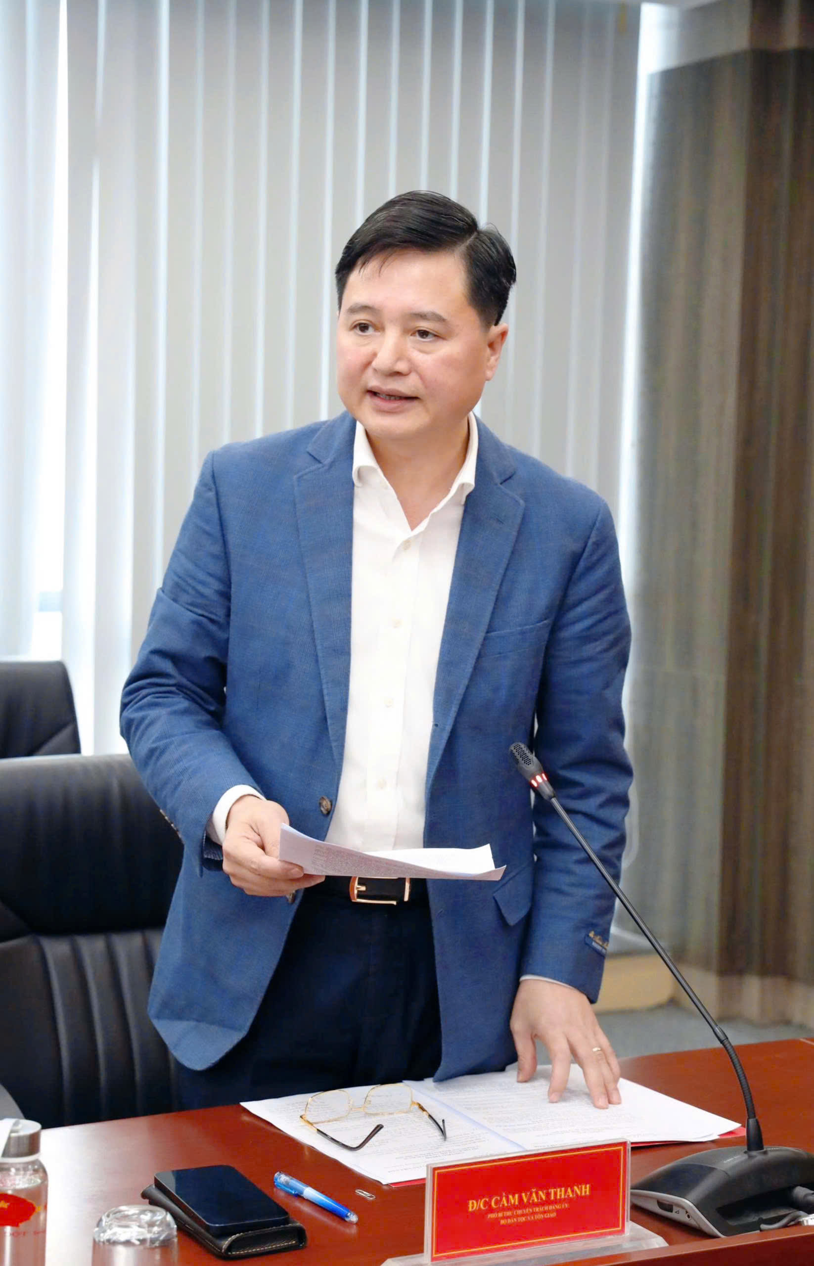 Phó Bí thư chuyên trách Đảng ủy Bộ, Phó Trưởng ban Ban Chỉ đạo 35 Cầm Văn Thanh nhấn mạnh vai trò của đội ngũ chức sắc, chức việc các tôn giáo và người có uy tín trong đồng bào các dân tộc trong công tác thông tin, tuyên truyền
