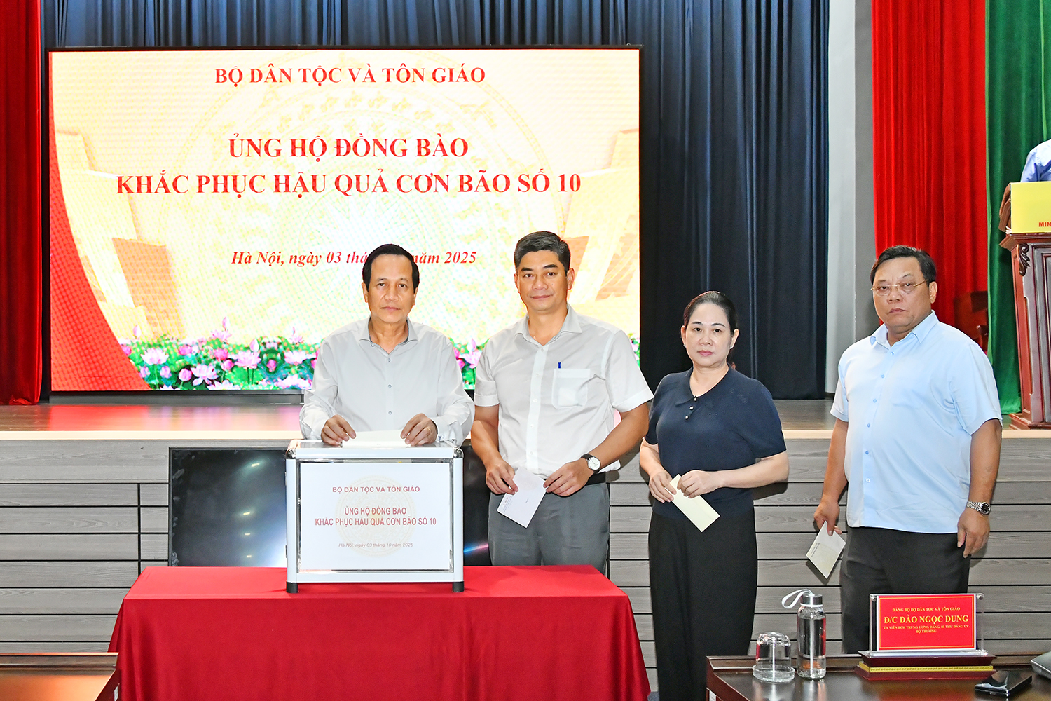 1 ngày trước | Lượt xem: 128 In bài viết |Chiều 03/10, tại Trụ sở Bộ Dân tộc và Tôn giáo, Bộ trưởng Bộ Dân tộc và Tôn giáo Đào Ngọc Dung cùng các đồng chí Thứ trưởng và toàn thể công chức, viên chức, người lao động thuộc Bộ Dân tộc và Tôn giáo đã tham gia quyên góp, ủng hộ đồng bào bị thiệt hại do cơn bão số 10 gây ra trong những ngày qua.