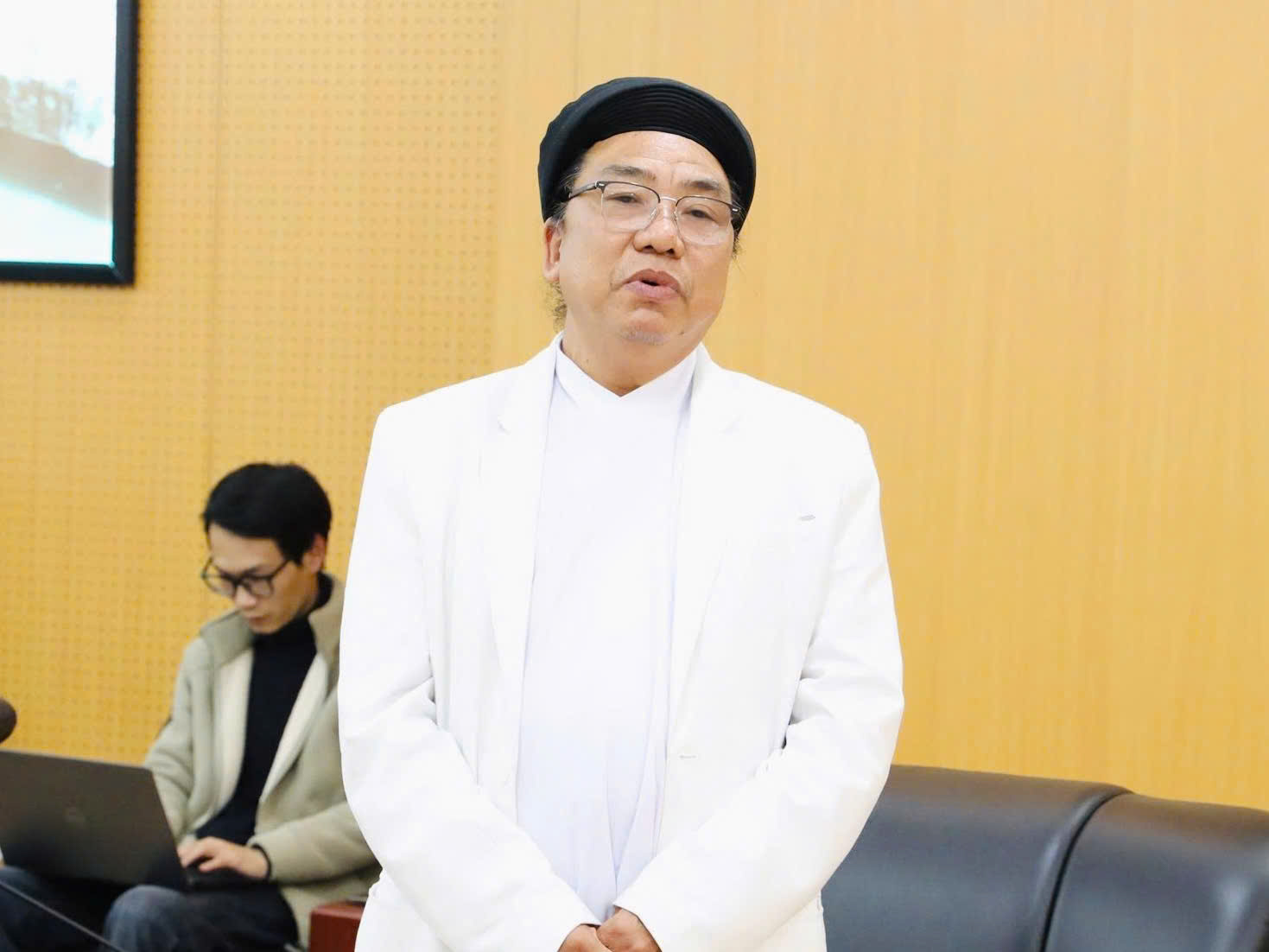 Chánh Phối sư Thượng Phong Thanh đại diện các Hội thánh Cao Đài báo cáo với Thứ trưởng Nguyễn Hải Trung về hoạt động của các Hội thánh Cao Đài trong năm 2025