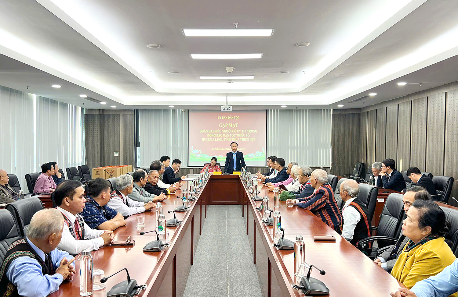 09:41 PM 28/11/2024 | Lượt xem: 2219 In bài viết |Chiều 28/11, tại trụ sở Ủy ban Dân tộc (UBDT), thừa ủy quyền của Lãnh đạo UBDT, bà Phạm Thị Thúy Hà, Phó Vụ trưởng Vụ Dân tộc thiểu số đã có buổi gặp mặt thân mật các đại biểu Người có uy tín (NCUT) tiêu biểu trong đồng bào DTTS huyện A Lưới, tỉnh Thừa Thiên Huế nhân dịp Đoàn ra thăm Thủ đô Hà Nội. Tham dự buổi gặp mặt có đại diện lãnh đạo một số vụ, đơn vị thuộc UBDT.
