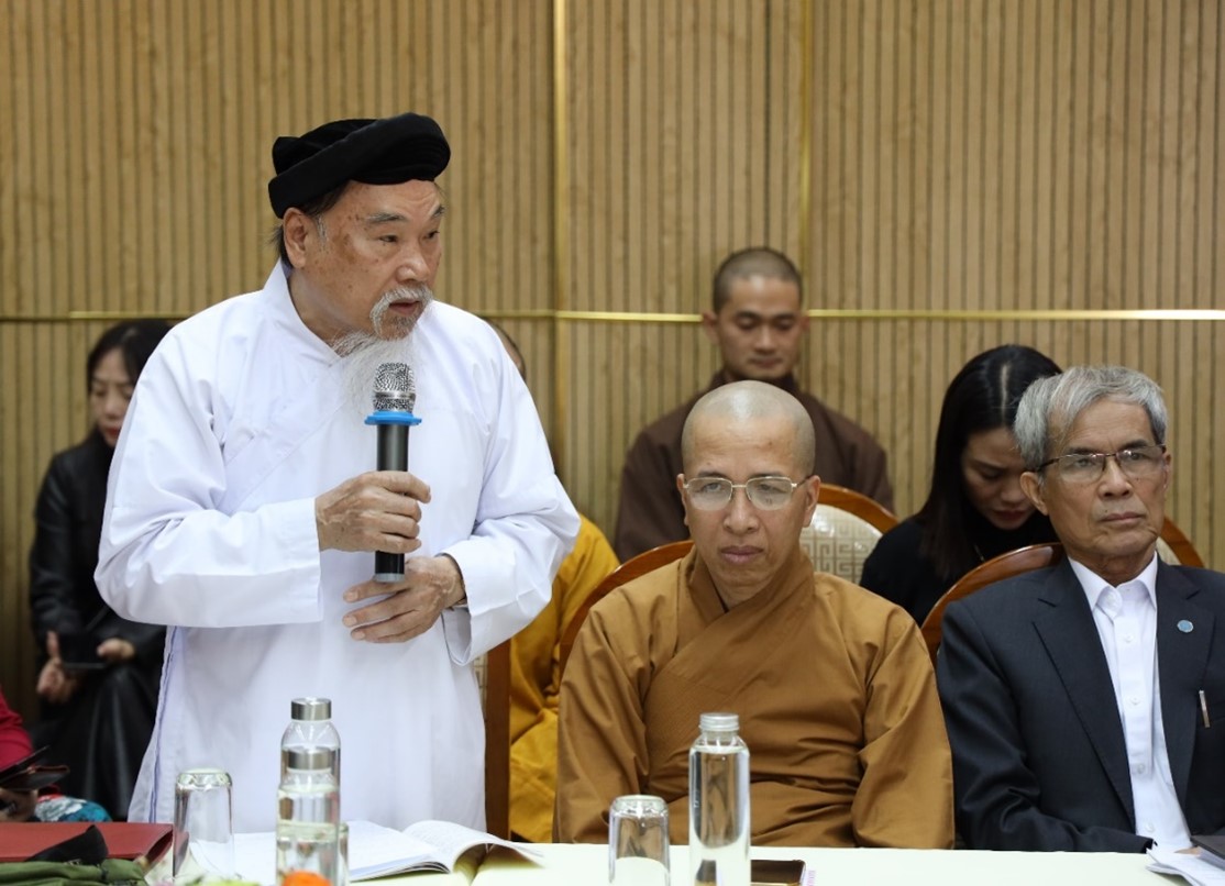 Giáo sư Thượng Mai Thanh, Trưởng ban Ban Cai quản Thánh thất Cao Đài thủ đô Hà Nội phát biểu tại Hội nghị