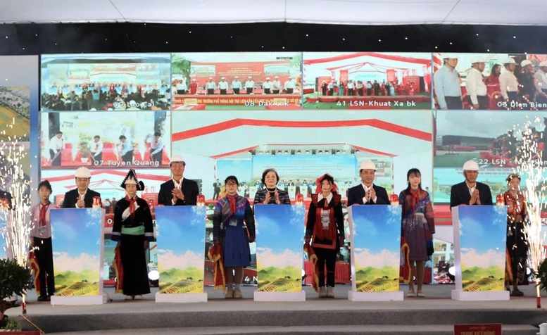 Phó Thủ tướng Phạm Thị Thanh Trà cùng các đại biểu thực hiện nghi thức khởi công xây dựng Trường Phổ thông Nội trú Liên cấp tại xã Mường Khương, tỉnh Lào Cai - Ảnh: VGP/Thu Giang