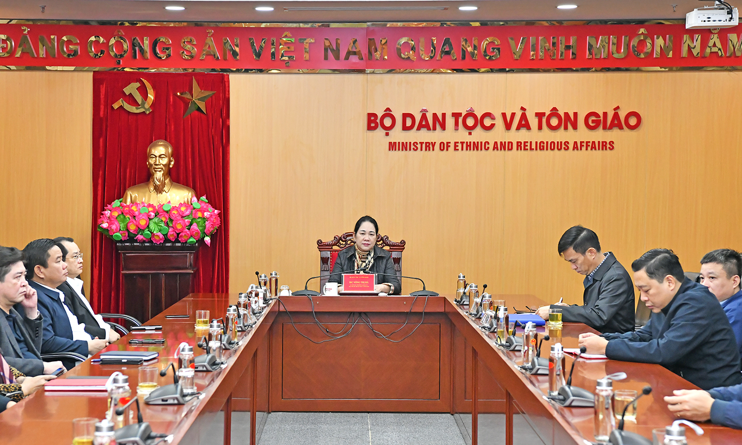 Thứ trưởng Nông Thị Hà cùng các đại biểu tham dự tại điểm cầu Bộ Dân tộc và Tôn giáo