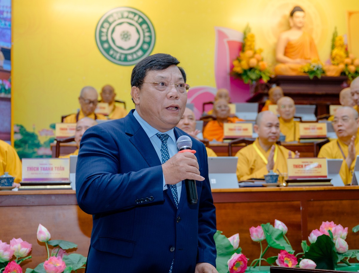 Phát biểu tại Hội nghị, Thứ trưởng Bộ Dân tộc và Tôn giáo Nguyễn Hải Trung chúc mừng những thành tựu Phật sự nổi bật của Giáo hội trong năm qua, đặc biệt là thành công của Đại lễ Vesak Liên hợp quốc 2025 - sự kiện được Chính phủ đánh giá rất cao và ghi nhận là một trong những thành tựu chung của đất nước. Qua đó, Thứ trưởng cũng ghi nhận những đóng góp của Giáo hội cùng tăng ni, Phật tử cả nước trong việc góp phần ổn định xã hội, đồng hành cùng dân tộc, chung tay xây dựng đất nước ngày càng phát triển, thịnh vượng.
