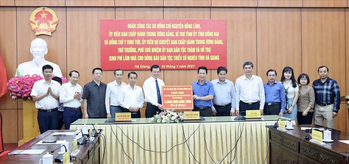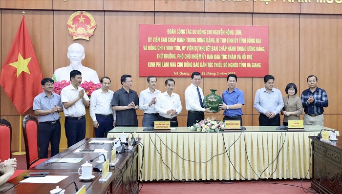 Ủy viên Ban Chấp hành Trung ương Đảng, Bí thư Tỉnh ủy Đồng Nai Nguyễn Hồng Lĩnh và Ủy viên dự khuyết Ban Chấp hành Trung ương Đảng, Thứ trưởng, Phó Chủ nhiệm Ủy ban Dân tộc Y Vinh Tơr trao kinh phí 3 tỷ đồng cho lãnh đạo tỉnh Hà Giang để hỗ trợ làm nhà cho đồng bào DTTS nghèo